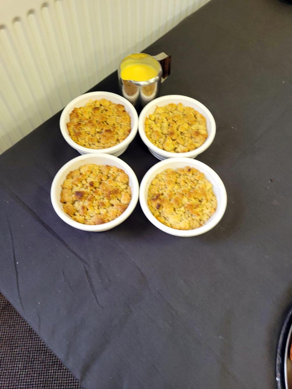 A dessert made of sweet and tangy succulent apples, topped with crumble consisting of flour, sugar, oats, cinnamon, and butter. Served with a choice of custard/whipped cream/ ice cream!
