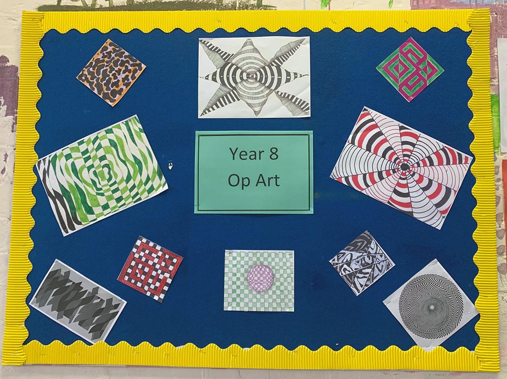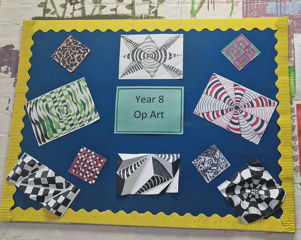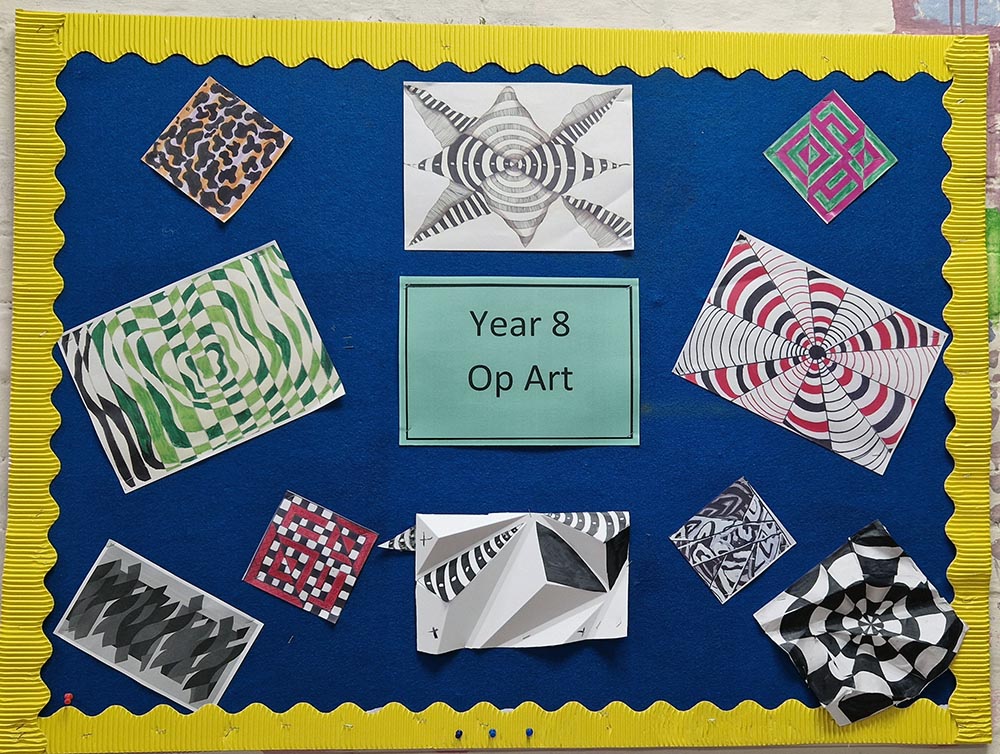 Year 8 explored the wonderful world of illusion and optical art this term looking at Brigit Riley and Victor Vaserley's works for inspiration. They enjoyed learning about this experiential and at times immersive and emotive style of art producing many original pieces during their own experiments. They also had a go at 3dimensional illusions and have created some impressive outcomes.